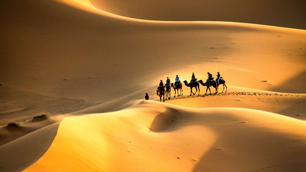 Difficile de ne pas passer par le Sahara quand on souhaite visiter le Maroc. Au sud-est du pays se niche justement le village saharien de Merzouga. C’est la porte d’entrée idéale pour partir explorer les plus grandes dunes marocaines. Appelé aussi Erg Chebbi, ce massif lunaire du Sahara offre un véritable paysage de carte postale. Ici, ce sont le désert, les dunes et les dromadaires tels que vous les avez toujours imaginé ! A perte de vue, vous ne trouverez qu’une mer de sable d’or.