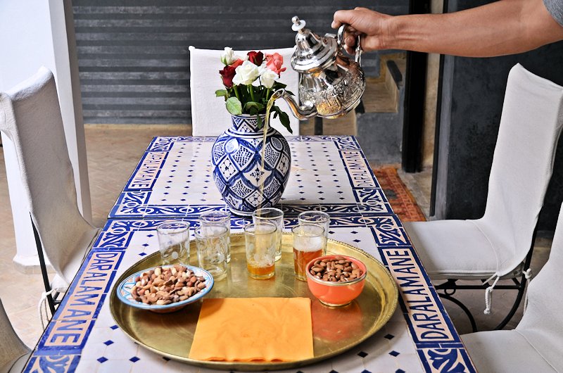 Dans le quartier de la Kasbah à Marrakech se situe le riad « DAR AL AMANE »,« Maison de la paix », bien située juste à 2 minutes des tombeaux Saadiens, à 5 minutes de la porte Bab Agnaou et 10 minutes de la fameuse place Jemaa El Fna. De l’aéroport, il faudra à peine 15 minutes environ. Une équipe dynamique, professionnelle, discrète et disponible saura vous recevoir dans la tradition Marocaine et vous assistera pour rendre votre séjour agréable. La maison est dotée d’une large cuisine équipée, un salon, un patio et 7 chambres, toutes munies d’une climatisation réversible et d’une salle de bain privée. Wifi et télévision au salon. Un petit plus, rare dans un riad à Marrakech : une petite piscine pour se rafraîchir pendant les mois chauds ! Une terrasse fleurie et équipée de transats permettra la détente ou un agréable bain de soleil au calme, ou tout simplement savourer un thé ou un repas et admirer le ciel étoilé.